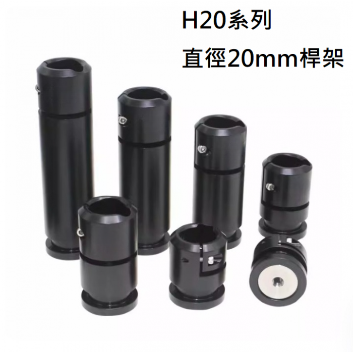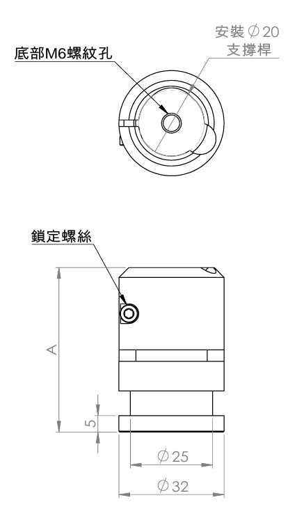 產品特色: 材質:鋁合金表面黑色陽極處理,用於固定直徑20mm支撐桿; 側邊螺絲撓性固定 + 三點定位設計,固定穩定; 底部安裝孔:M6螺紋孔; 可直接搭配Y型壓條固定。 型號 高度(mm) 重量(g) H20-30M 30 40 H20-40M 40 49 H20-50M 50 61 H20-60M 60 72 H20-80M 80 96 H20-100M 100 117 H20-120M 120 141