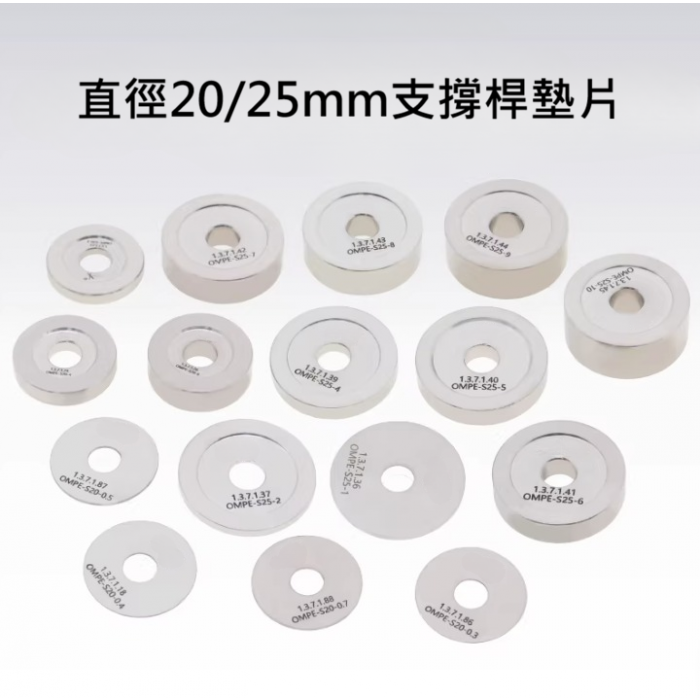 這些墊片可以墊高支撐桿的高度,而不影響結構剛性,不銹鋼材質精密加工,中心 6 mm 通孔,外徑 20 mm 或 25 mm,有多種厚度可選。