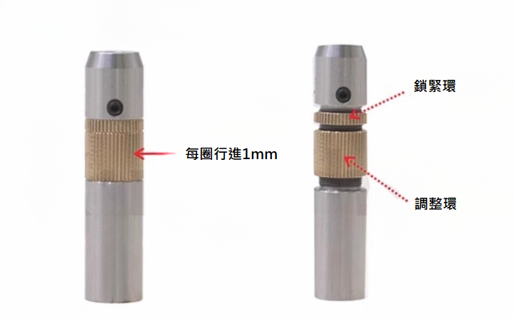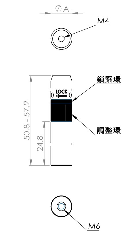 產品特徵: 不銹鋼材質,黃銅滾花旋鈕,可靈活調節高度; 每轉一圈行進 1 mm; 上端為M4螺紋、下端為M6螺紋; 兩種直徑可選:12mm或0.5吋(12.7mm); 型號 行程 備註 重量(g) P12-Z 6.4mm 直徑A=12mm 38.1 P05-Z 6.4mm 直徑A=0.5"(12.7mm) 42.2