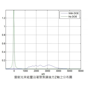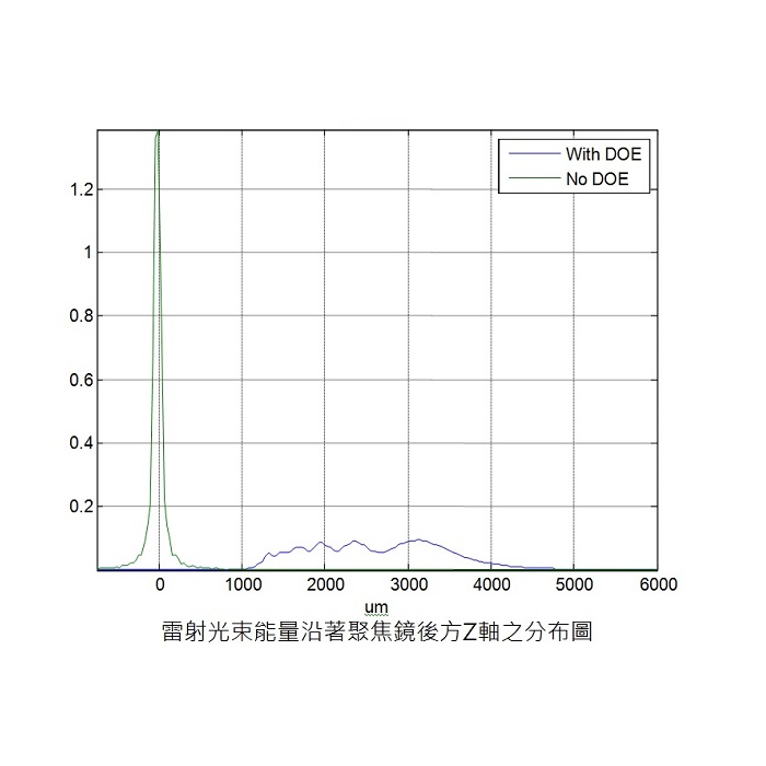 延長焦點深度繞射元件,可輕易解決這樣的問題,在指定的雷射條件下(光束直徑、輸出模態與光束品質M2值),通過延長焦深繞射片,再以透鏡聚焦,即可在幾乎不影響繞射極限的焦點大小下,延長焦點深度,非常助益於雷射對透明材料(如玻璃、矽)的加工如切割、鑽孔與高解析顯微鏡與深度生醫檢測的應用。