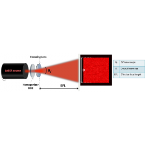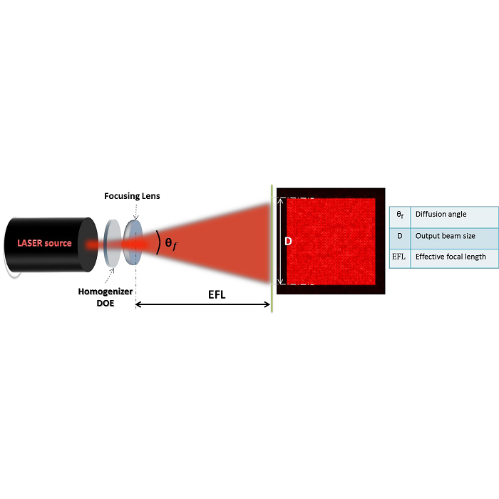 均勻光斑形狀經過設計可以是圓形、橢圓形、方形、長方形、線形;繞射元件上的圖案是經過精密的半導體蝕刻製程所製造,可以非常精確的控制雷射光束的發散角,從而控制均勻光斑的尺寸,由於在此區域範圍內的光強度分布是均勻的,因此可以更精準地控制單位面積光的強度(W/cm2),在許多的應用上有很大的助益。