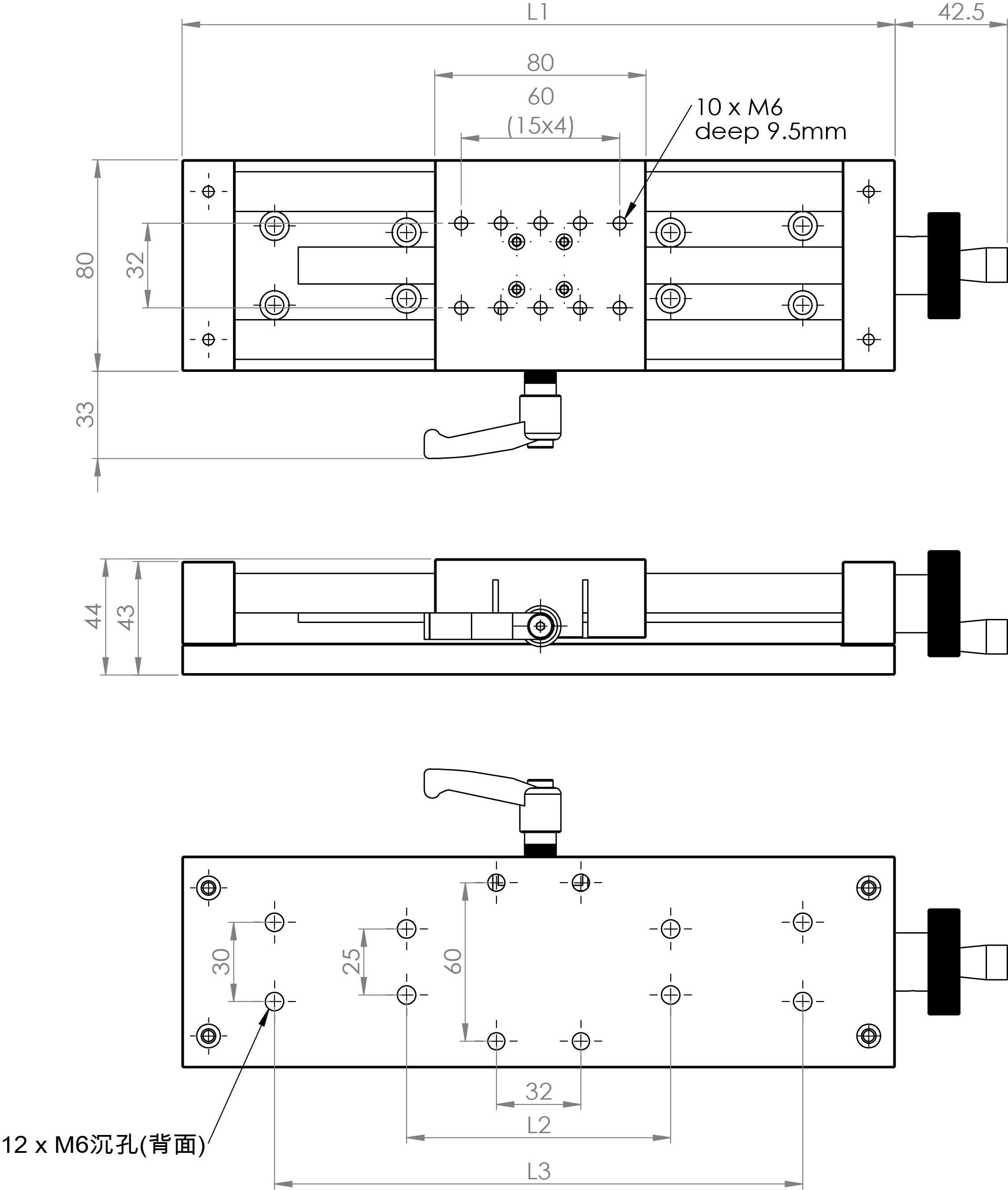 材質:鋁合金6061 檯面尺寸:80x80mm 導螺桿驅動,螺距2mm M6-25X 沉孔可直接固定在M6-25孔位的光學桌 荷重:30 kgf 型號 行程(mm) L1 L2 L3 陽極處理 SL8050A 50 170 50 100 黑色 SL8050B 50 170 50 100 銀色 SL8100A 100 220 100 150 黑色 SL8100B 100 220 100 150 銀色 SL8150A 150 270 100 200 黑色 SL8150B 150 270 100 200 銀色