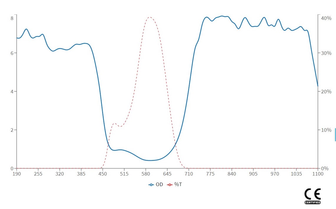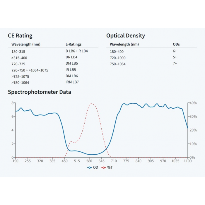 OD(Optical Density):為對雷射的阻擋力,數值越大對雷射阻擋的能力越高,在可見光雷射的應用時,須考慮對光時仍要保持看得到雷射光點而又不刺眼的狀態,因此要選擇適當的OD值,以免阻擋過大而看不到雷射光點無法對光,OD值對應穿透率與阻擋值可參考以下表格: