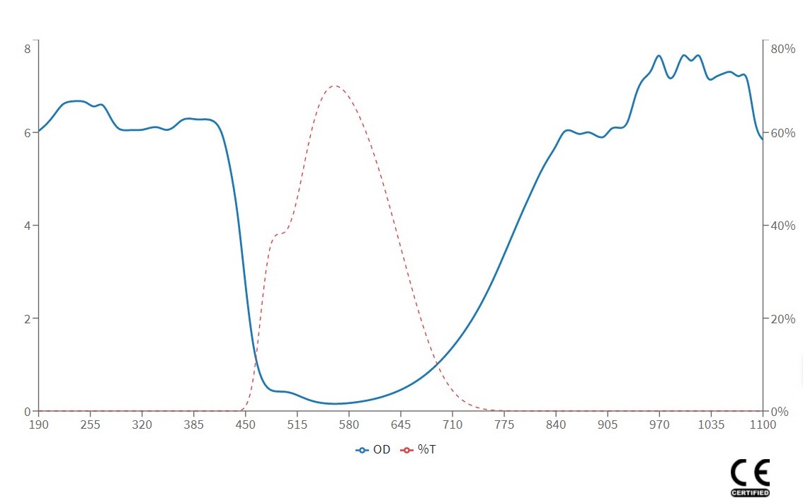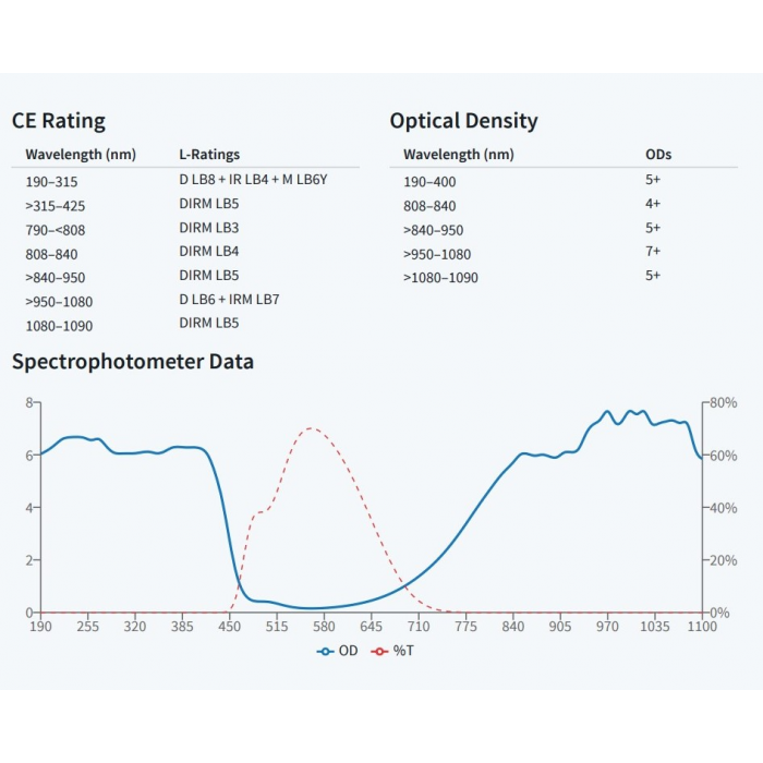 OD(Optical Density):為對雷射的阻擋力,數值越大對雷射阻擋的能力越高,在可見光雷射的應用時,須考慮對光時仍要保持看得到雷射光點而又不刺眼的狀態,因此要選擇適當的OD值,以免阻擋過大而看不到雷射光點無法對光,OD值對應穿透率與阻擋值可參考以下表格: