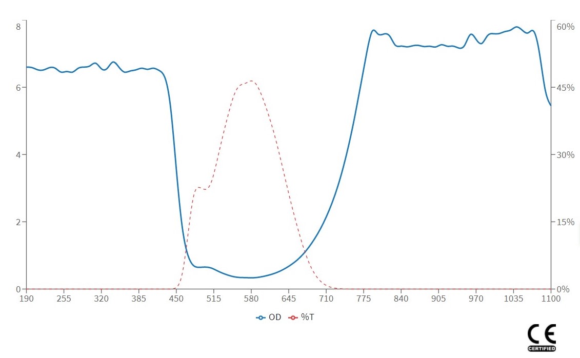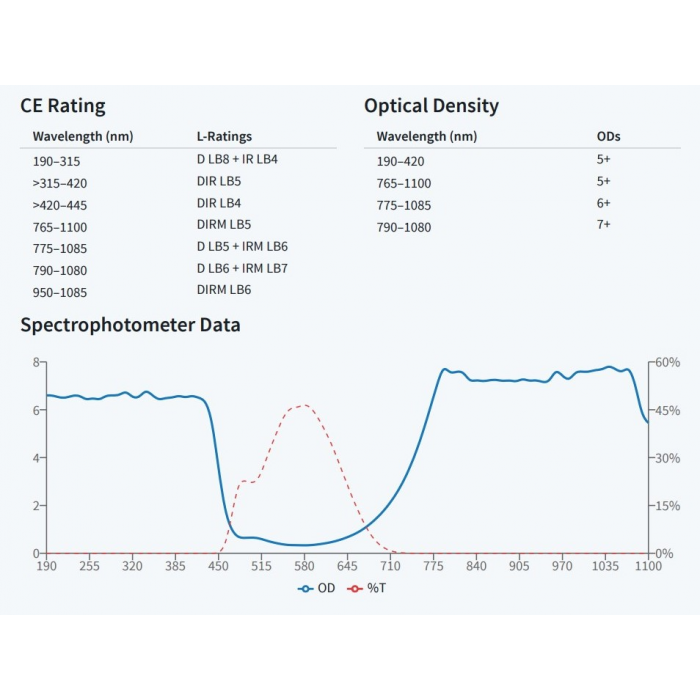 OD(Optical Density):為對雷射的阻擋力,數值越大對雷射阻擋的能力越高,在可見光雷射的應用時,須考慮對光時仍要保持看得到雷射光點而又不刺眼的狀態,因此要選擇適當的OD值,以免阻擋過大而看不到雷射光點無法對光,OD值對應穿透率與阻擋值可參考以下表格: