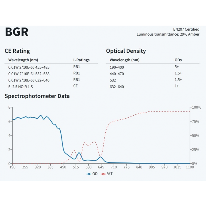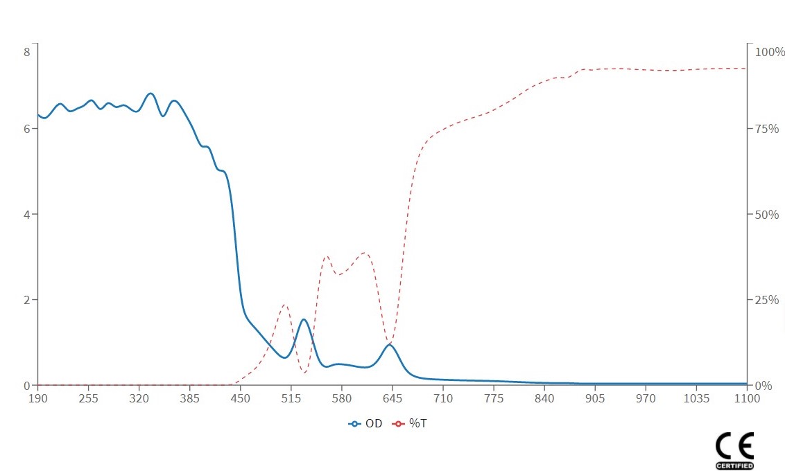 OD(Optical Density):為對雷射的阻擋力,數值越大對雷射阻擋的能力越高,在可見光雷射的應用時,須考慮對光時仍要保持看得到雷射光點而又不刺眼的狀態,因此要選擇適當的OD值,以免阻擋過大而看不到雷射光點無法對光,OD值對應穿透率與阻擋值可參考以下表格: