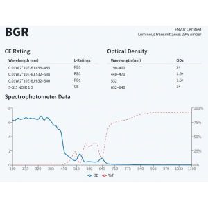 VLT(Visible Light Transmittance):為可見光波段的穿透率,選擇不可見光的雷射護目鏡時,須考慮雷射在加工金屬時,會產生刺眼的閃焰,這種應用不但要阻擋雷射,也需阻擋閃焰,這時就須考慮使用VLT較低的護目鏡,但是部分VLT很低((VLT<10%)的護目鏡,配帶時視野會非常暗,此時則會需要搭配輔助照明,否則會讓使用者不想配戴。