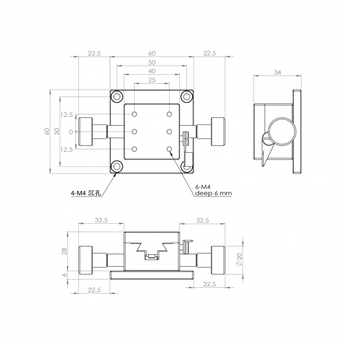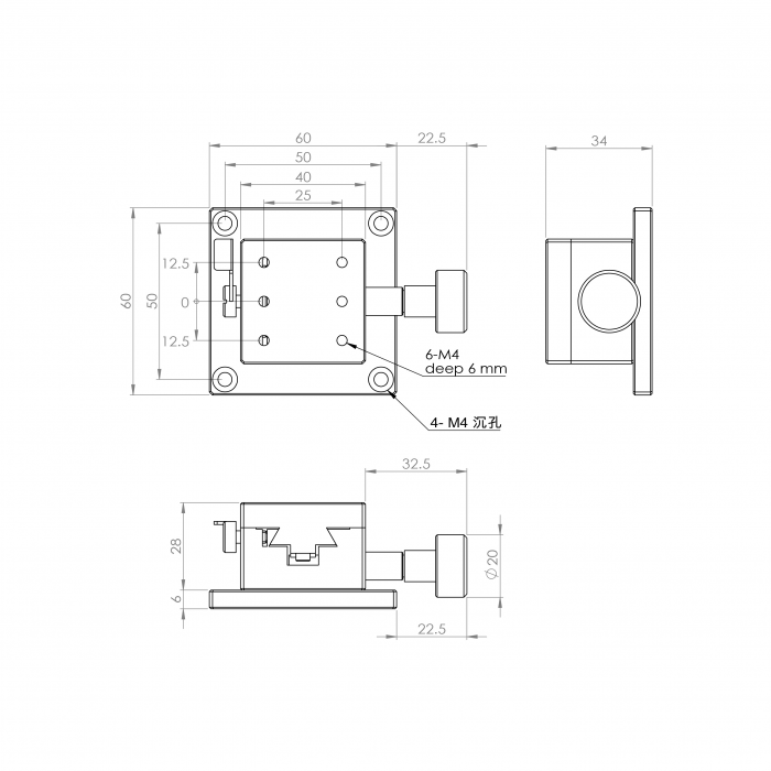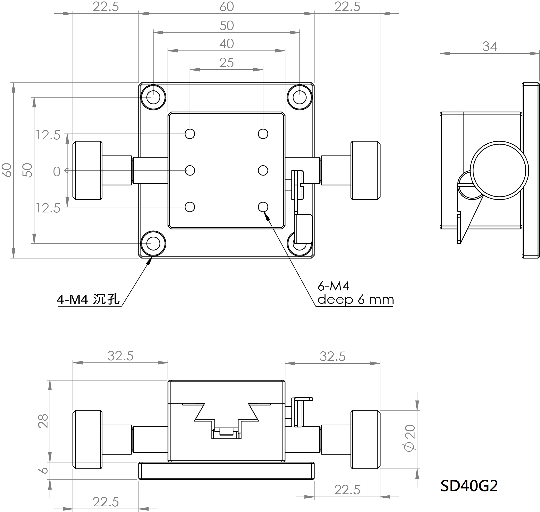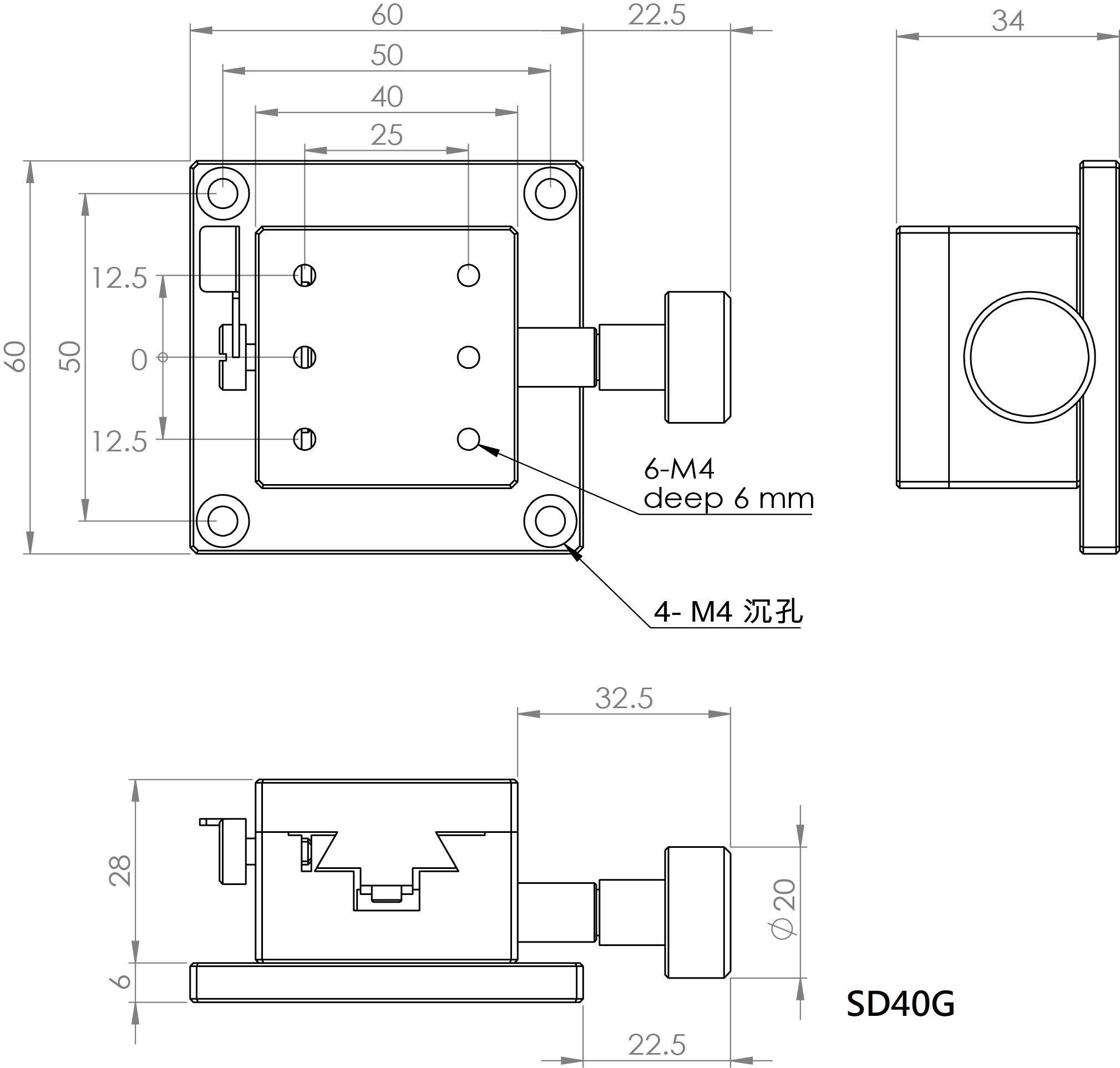 型號:SD40G 材質:鋁合金黑色陽極處理 檯面尺寸:40 x 40 mm 厚度:34 mm 行程:20 mm 齒輪齒條驅動:1圈移動量18mm 讀取精度:0.1mm 荷重:3 kgf 重量:0.22 kg