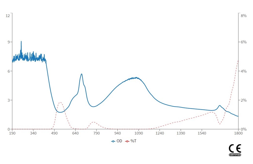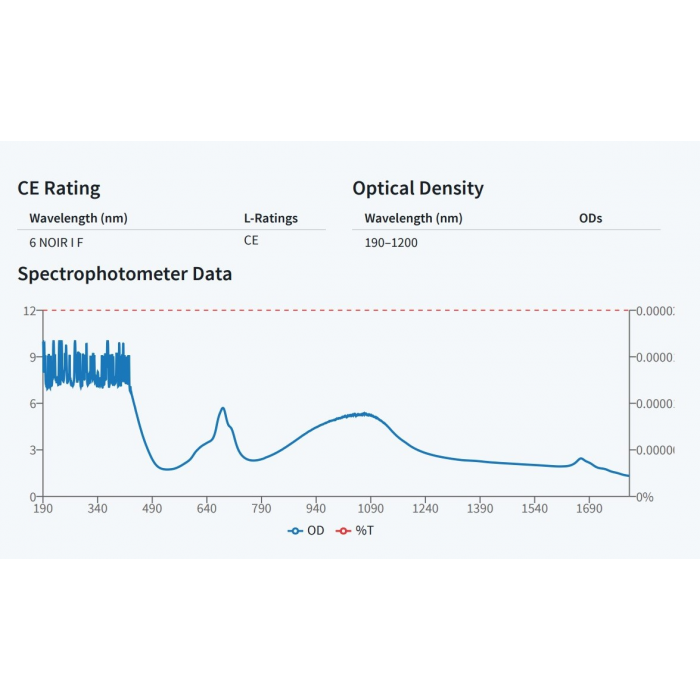 OD(Optical Density):為對雷射的阻擋力,數值越大對雷射阻擋的能力越高,在可見光雷射的應用時,須考慮對光時仍要保持看得到雷射光點而又不刺眼的狀態,因此要選擇適當的OD值,以免阻擋過大而看不到雷射光點無法對光,OD值對應穿透率與阻擋值可參考以下表格: