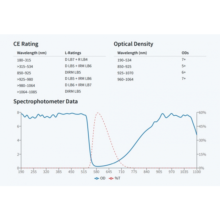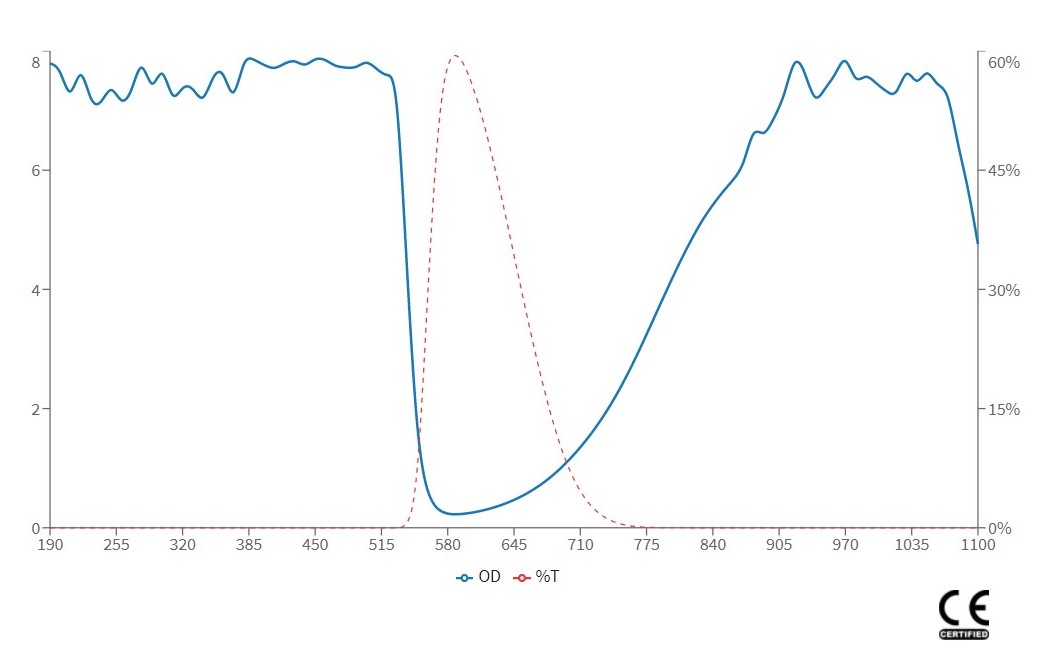 OD(Optical Density):為對雷射的阻擋力,數值越大對雷射阻擋的能力越高,在可見光雷射的應用時,須考慮對光時仍要保持看得到雷射光點而又不刺眼的狀態,因此要選擇適當的OD值,以免阻擋過大而看不到雷射光點無法對光,OD值對應穿透率與阻擋值可參考以下表格: