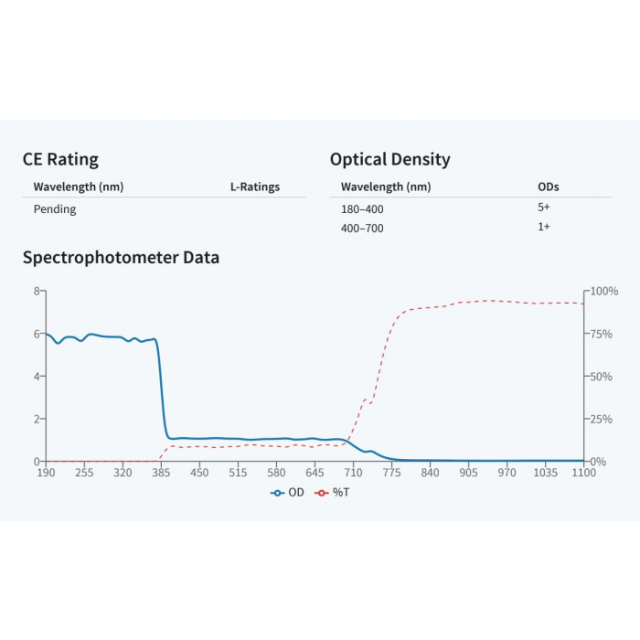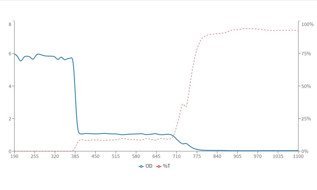 OD(Optical Density):為對雷射的阻擋力,數值越大對雷射阻擋的能力越高,在可見光雷射的應用時,須考慮對光時仍要保持看得到雷射光點而又不刺眼的狀態,因此要選擇適當的OD值,以免阻擋過大而看不到雷射光點無法對光,OD值對應穿透率與阻擋值可參考以下表格: