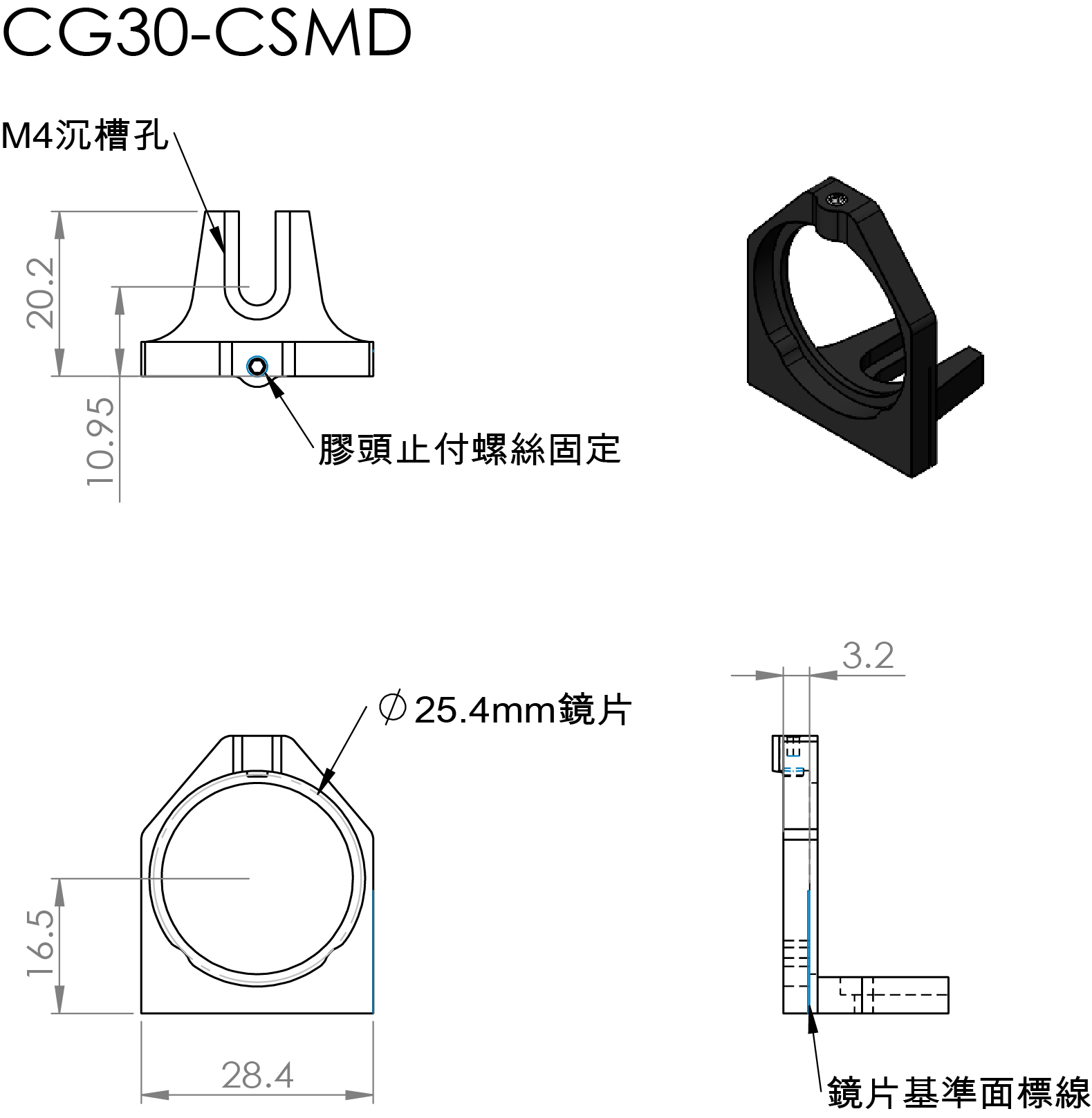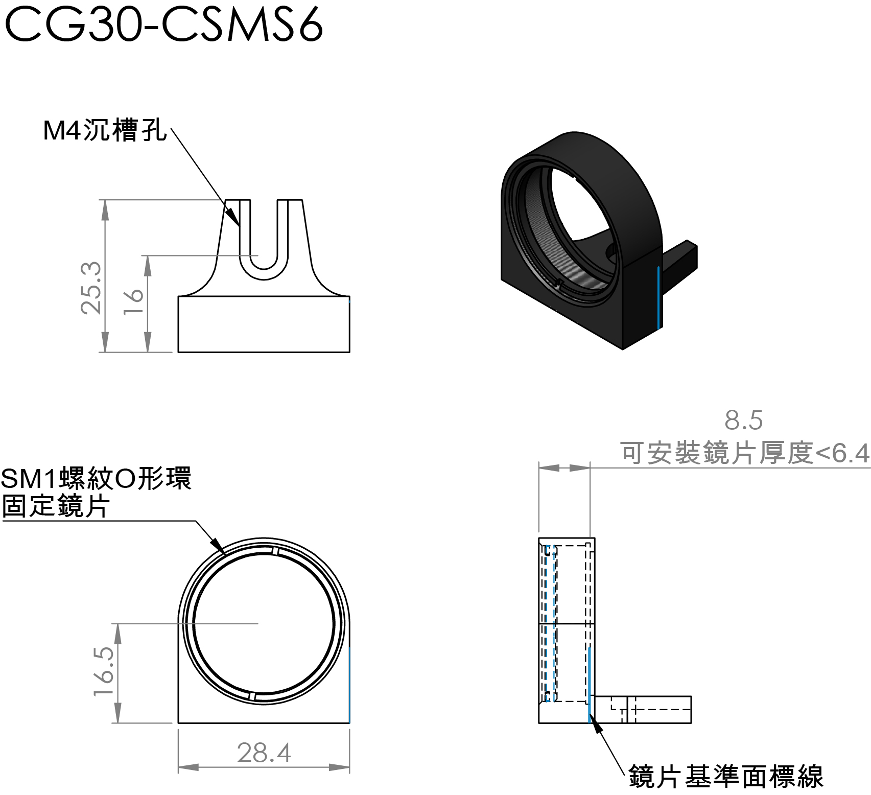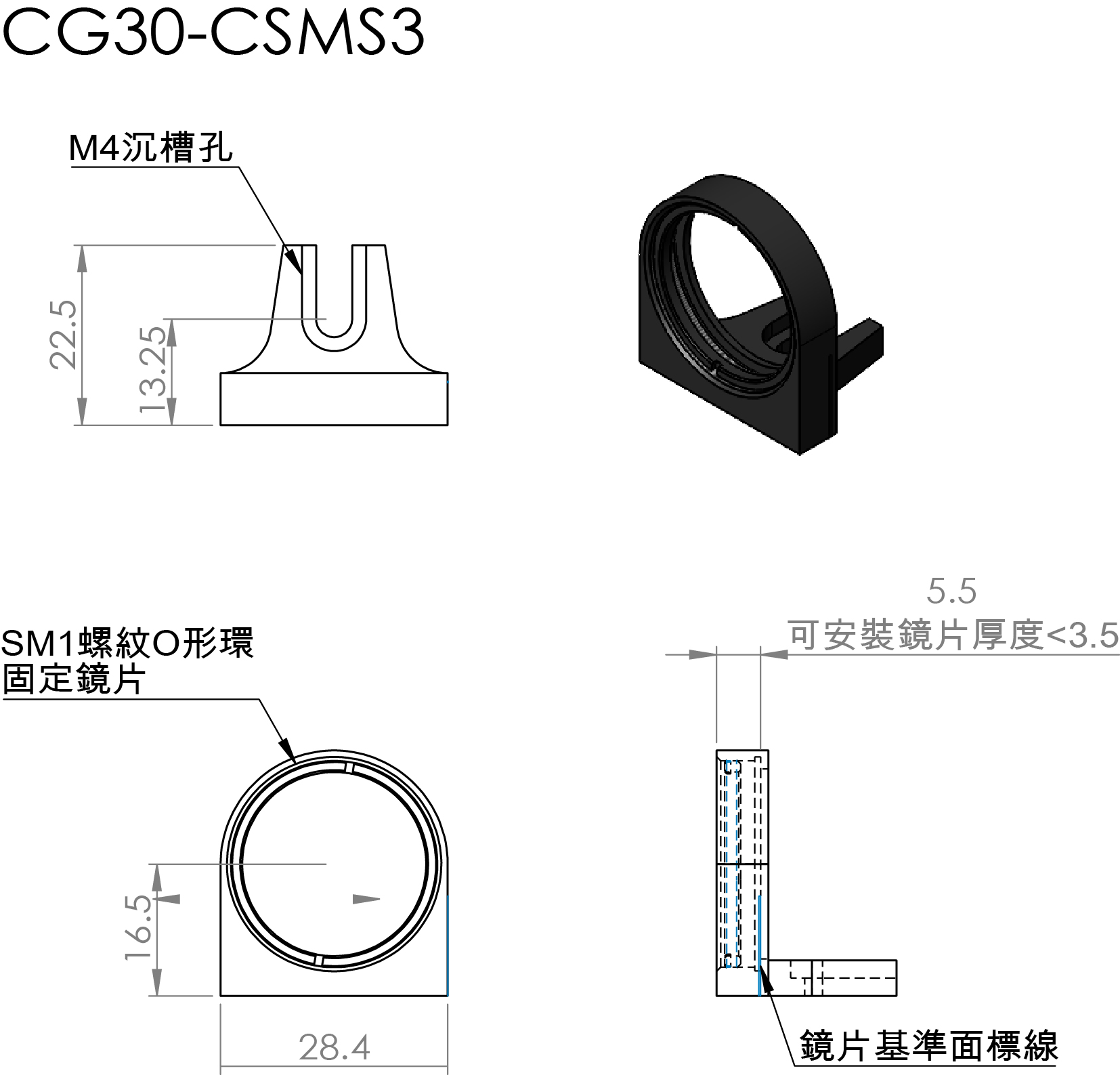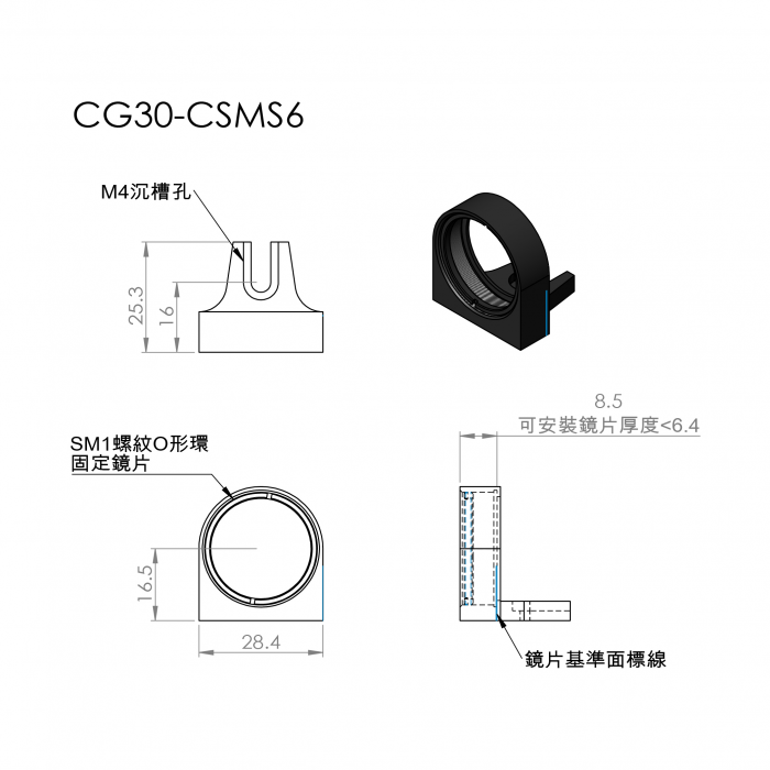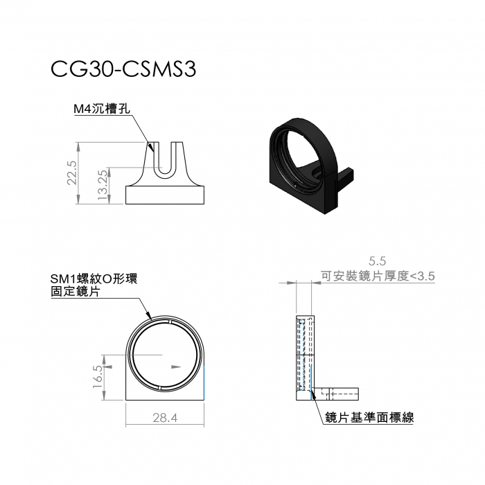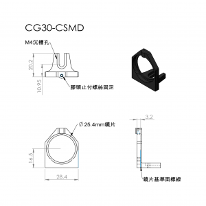 CG30-CSM專為安裝Ø1英寸光學元件而設計。需搭載在CG30-CSS系列平台上才能應用在籠式立方體內,使用附帶的螺絲將安裝架固定到立方體平台上。