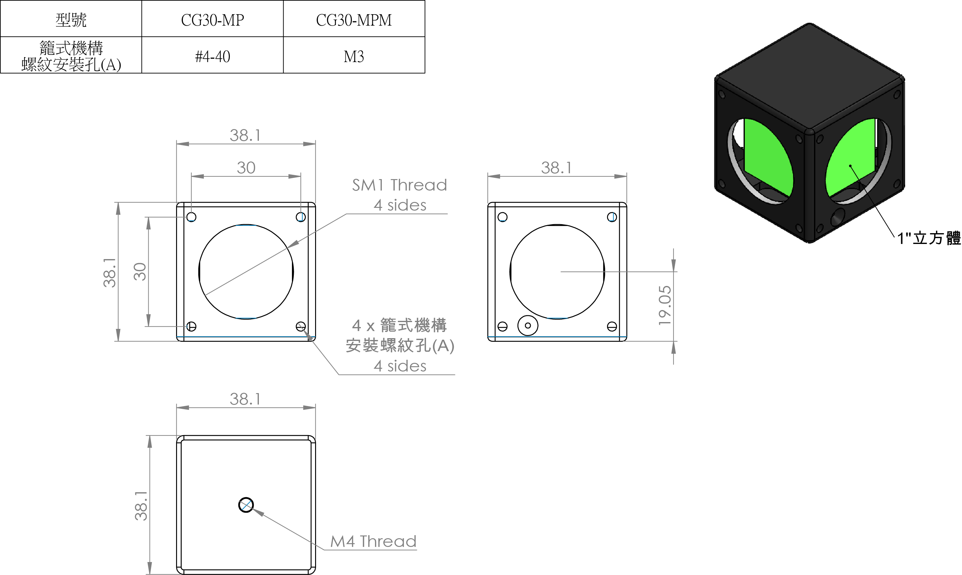 • 側面的SM1螺紋孔周圍有4個公制M3或英制#4-40螺孔可連接籠式機構支桿;