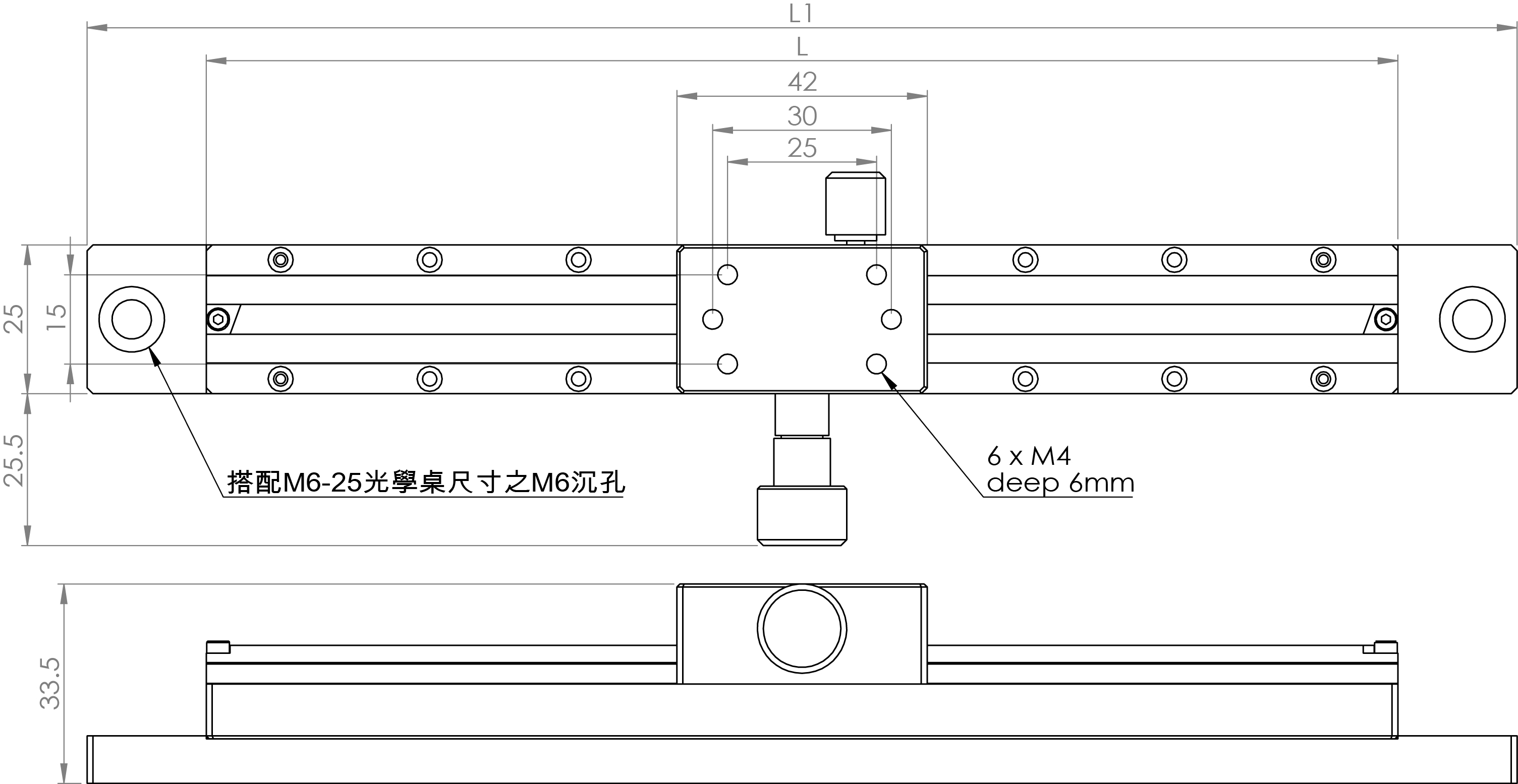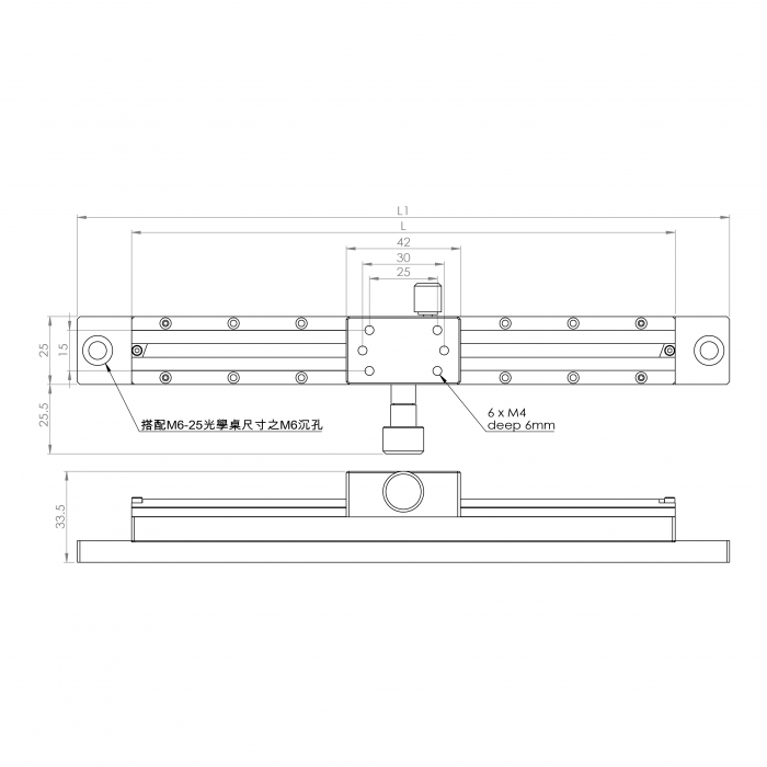 材質:鋁合金黑色陽極處理 檯面尺寸:25 x 42 mm 齒輪齒條驅動 荷重:3kgf 可搭配多個滑塊 型號 行程 (mm) L/L1 (mm) 平行度 (mm) SD25G-50 30 50/90 0.05 SD25G-70 50 70/110 0.05 SD25G-100 80 100/140 0.05 SD25G-150 130 150/190 0.1 SD25G-200 180 200/240 0.15 選配:SD25G-C 滑塊