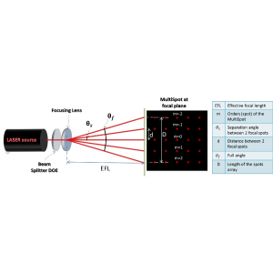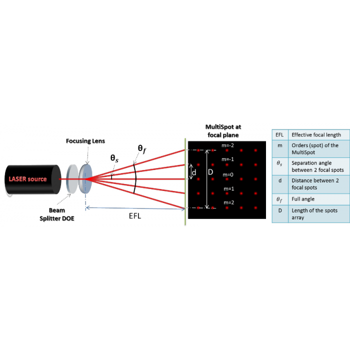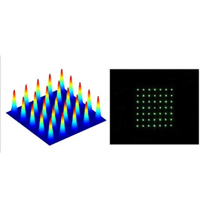 以Fused Silica或ZnSe為基材,蝕刻繞射圖案,鍍上抗反射膜,可以勝任在高能量或高功率雷射的應用,且可以適合UV-IR各種不同波長的雷射,二維分光繞射元件不受雷射的輸出模態的影響,但會有最小的入射光束直徑限制。