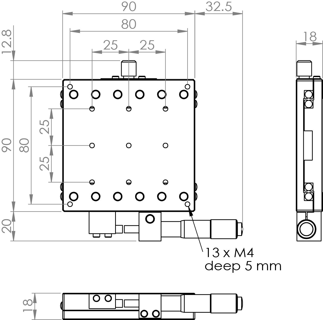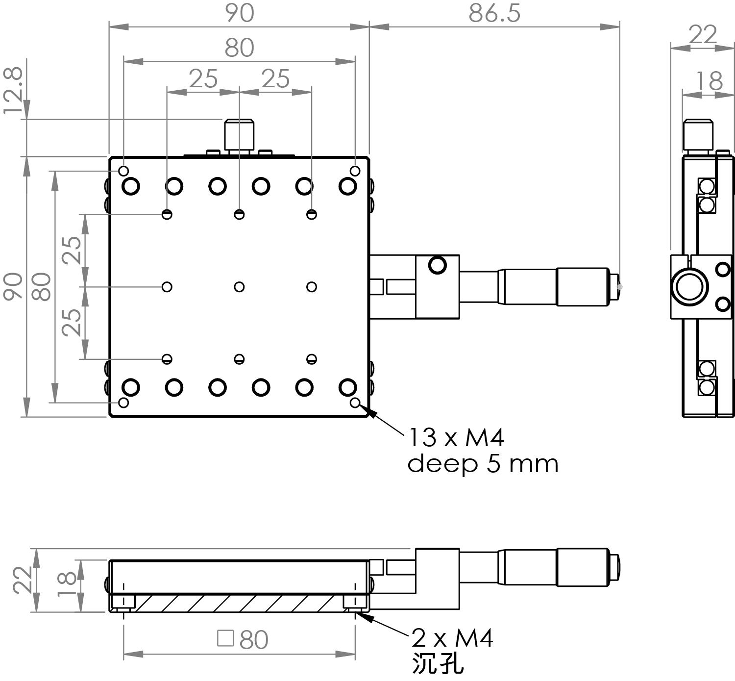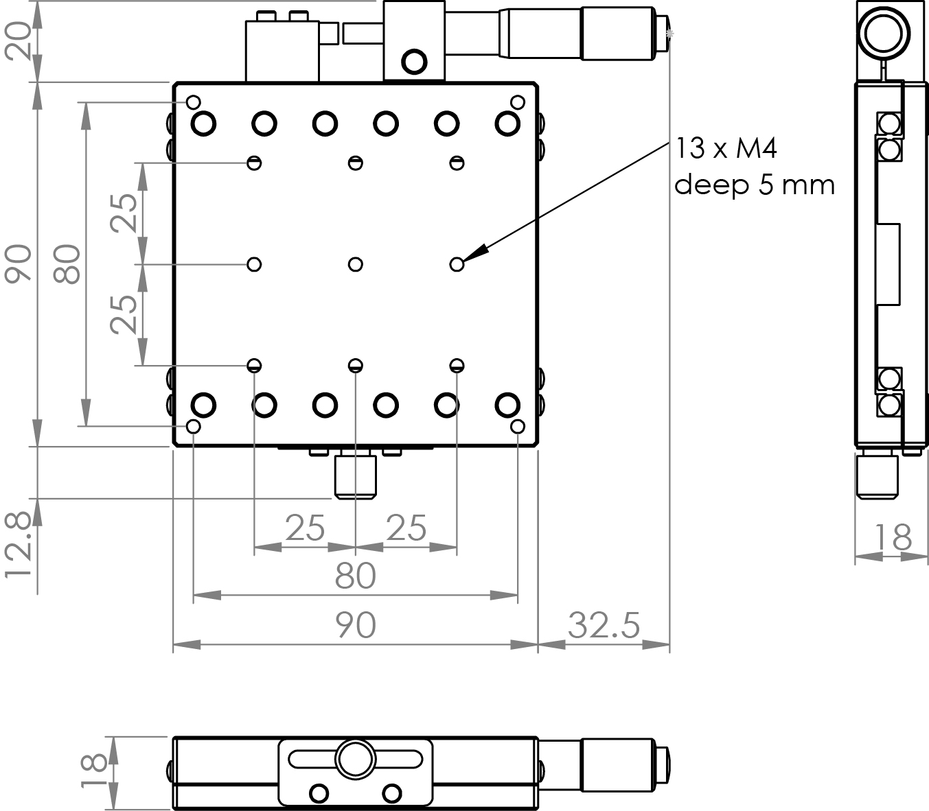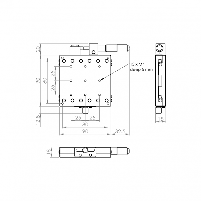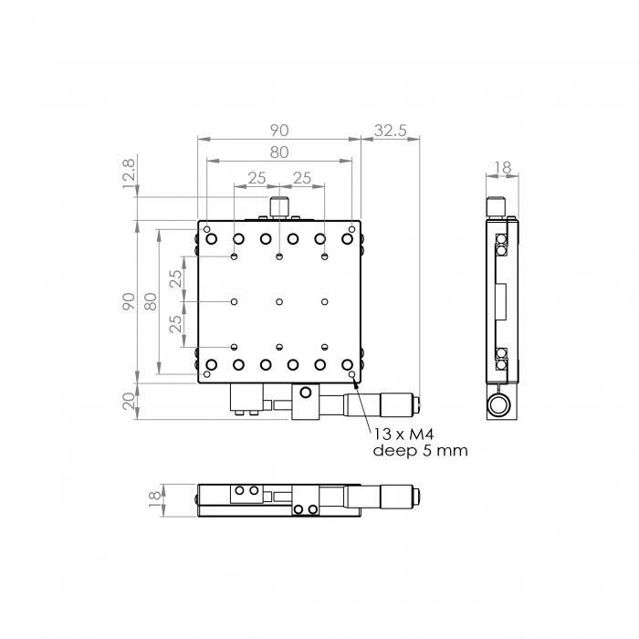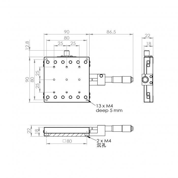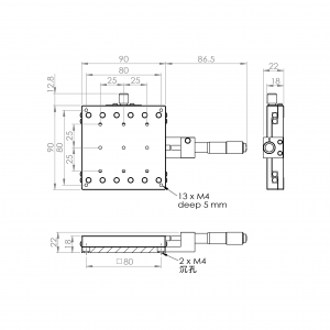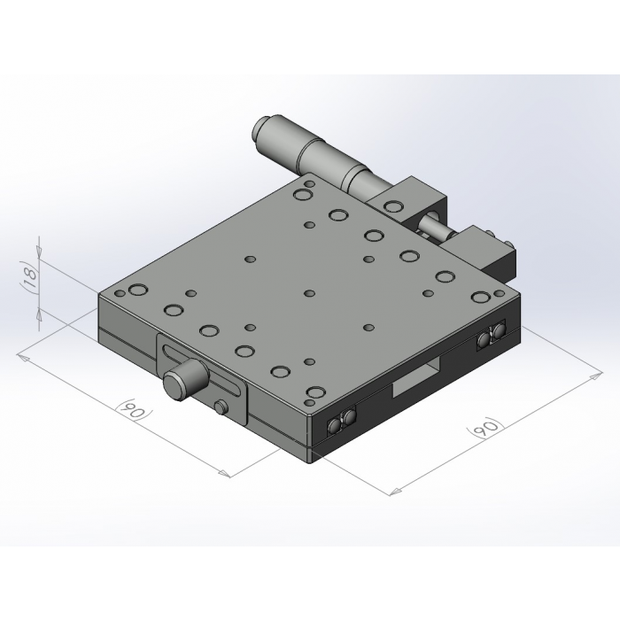材質:鋁合金黑色陽極處理 檯面尺寸:90 x 90 mm 厚度:18 mm 行程:25 mm 驅動方式:分厘卡頭 讀取精度:0.01mm 平行度:0.03mm 荷重:9.50 kgf 重量:0.47 kg 型號: ST90AC 分厘卡頭位在中心 ST90AL 分厘卡頭位在左側 ST90AR 分厘卡頭位在右側