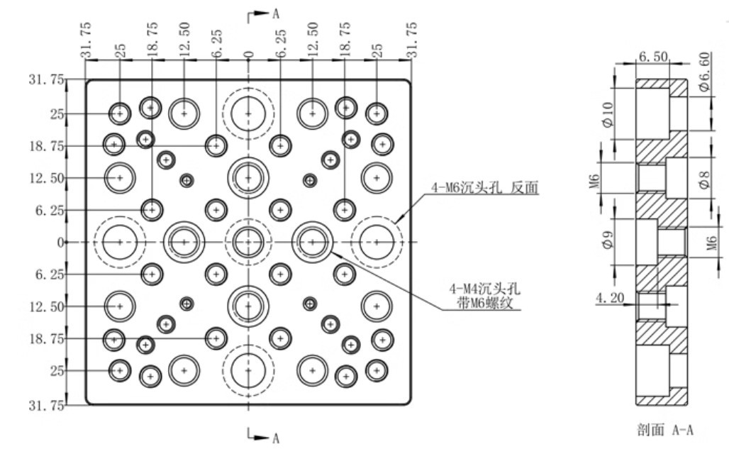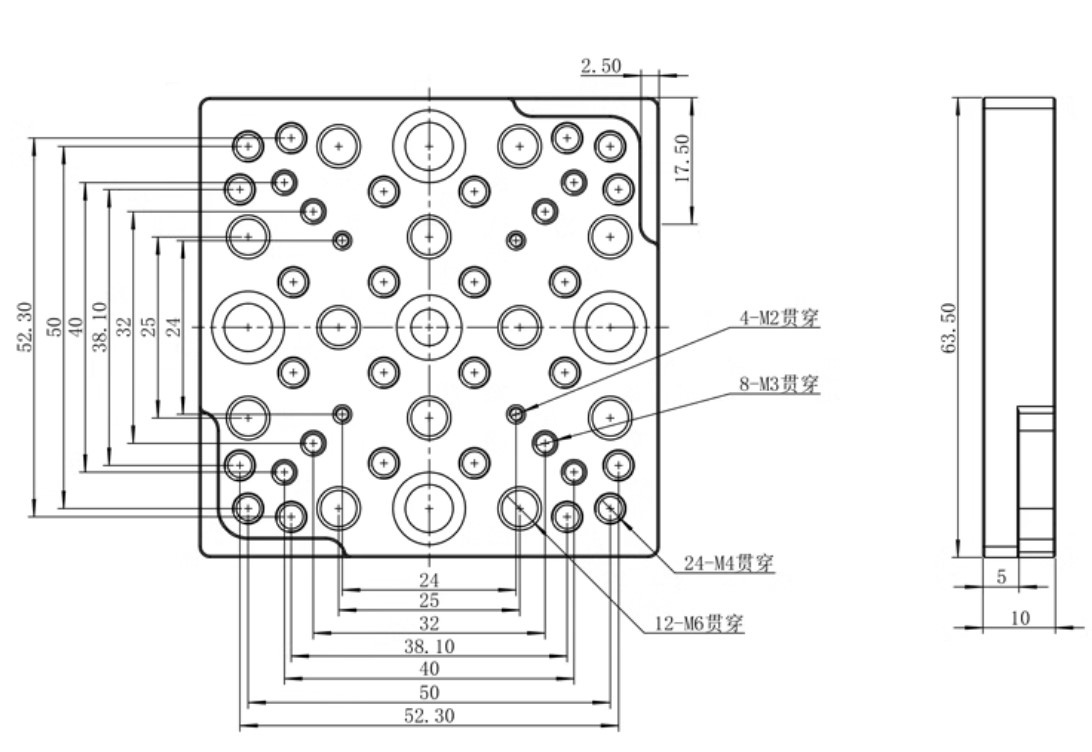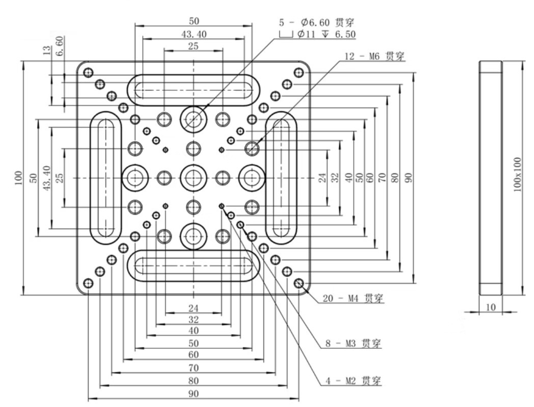 通用型轉接板,多種安裝孔設計,可以搭配不同尺寸的平移台轉接到光學桌上