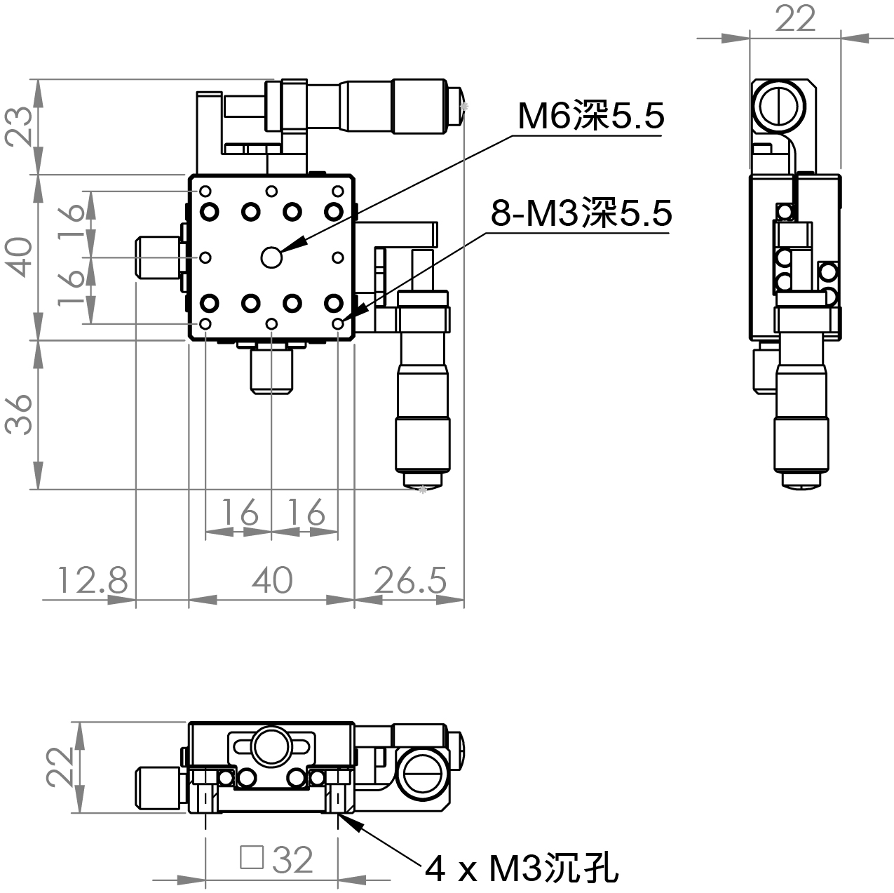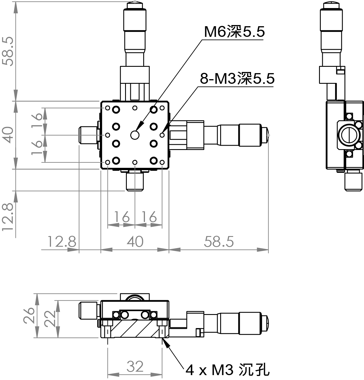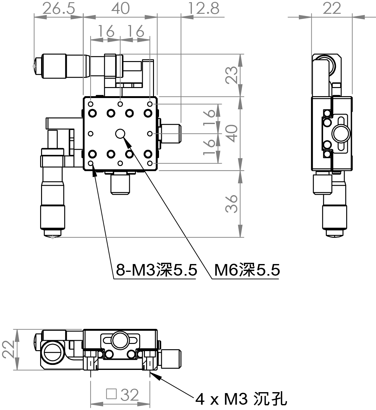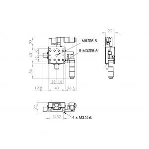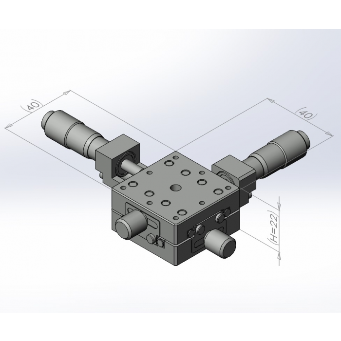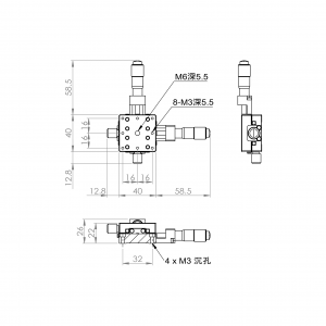 超薄XY軸一體型設計 材質:鋁合金黑色陽極處理 檯面尺寸:40 x 40 mm 厚度:22 mm 行程:13 mm 驅動方式:分厘卡頭 讀取精度:0.01mm 平行度:0.04mm 荷重:1 kgf 重量:0.21 kg 型號: ST240ACU 分厘卡頭位在中心 ST240ALU 分厘卡頭位在左側 ST240ARU 分厘卡頭位在右側