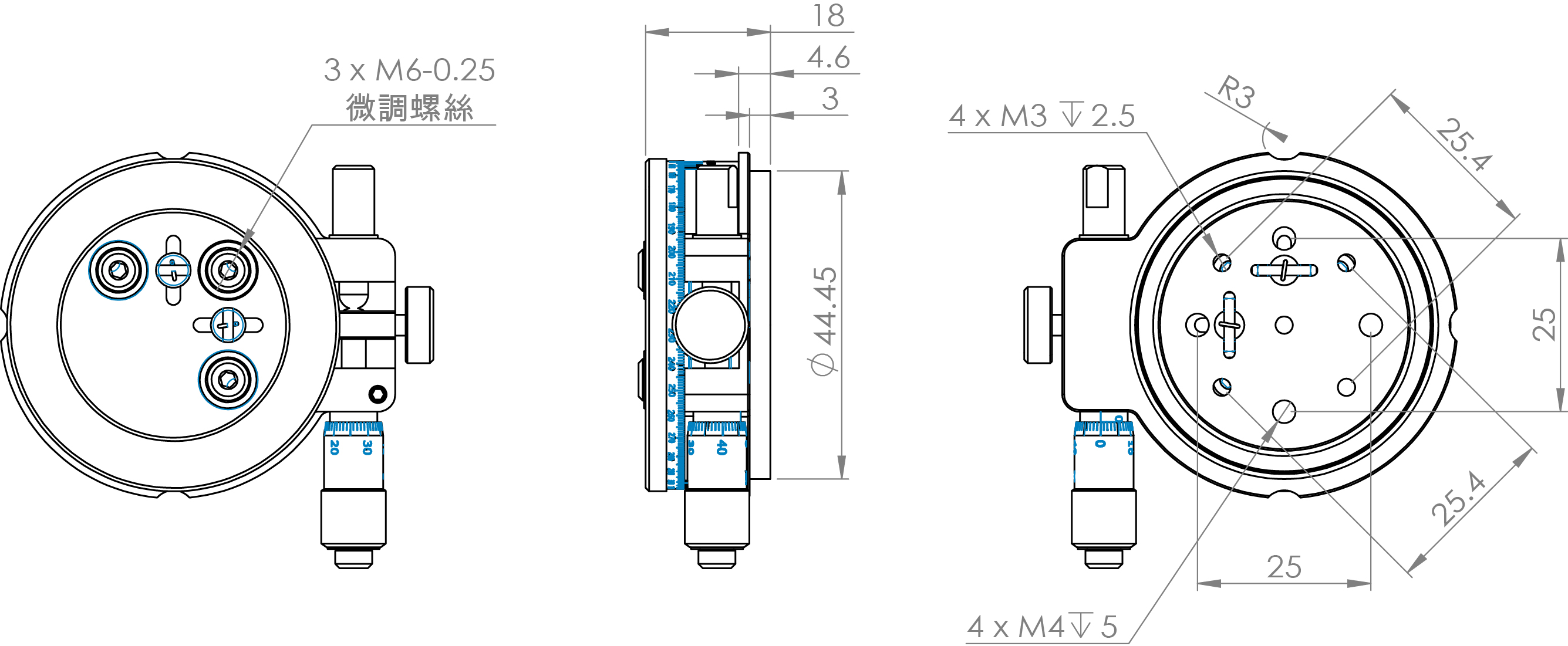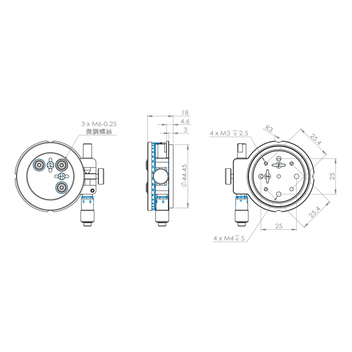 可安裝在30mm籠式立方體的頂部或底部,能夠用來將各種光學元件安裝到籠式立方體中。 CG30-CSSAR立方體傾斜/旋轉微調平台是具有三個M6-0.25精密微調螺絲加上分厘卡頭微調旋轉角度 ,可以提供俯仰、滾動調節、Z方向平移以及精密調整旋轉角度。