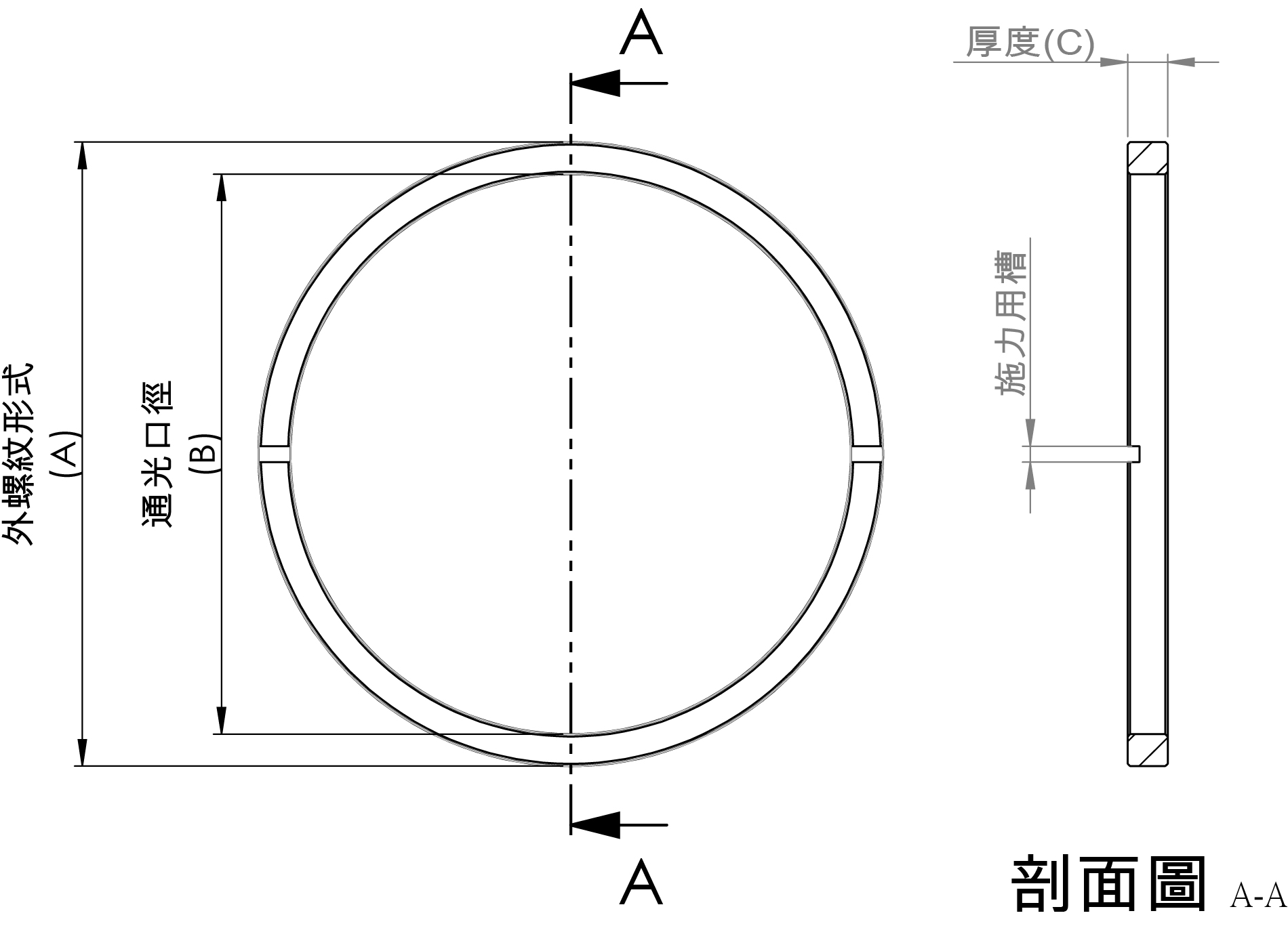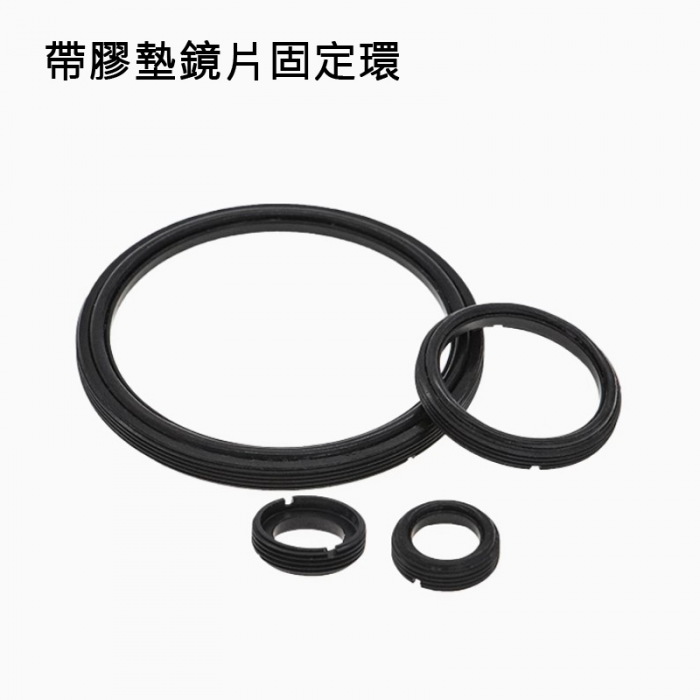 帶膠墊外螺紋鏡片固定環 搭配丁晴橡膠材質的O形環,可減少鏡片與固定環之間的應力,降低對偏振態的影響,並且達到密封的效果。 施力用槽可使用固定環安裝扳手安裝到鏡筒內。 型號 螺紋形式 (A) 通光口徑 B (mm) 厚度 C (mm) 適用鏡片直徑 (mm) LT05OR SM05(0.535"-40) 11 3.8 12.7 LT1OR SM1(1.035"-40) 22 4.1 25.4 LT2OR SM2(2.035"-40) 47.5 4.6 50.8