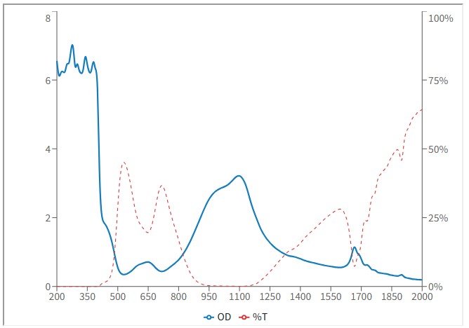 OD(Optical Density):為對雷射的阻擋力,數值越大對雷射阻擋的能力越高,在可見光雷射的應用時,須考慮對光時仍要保持看得到雷射光點而又不刺眼的狀態,因此要選擇適當的OD值,以免阻擋過大而看不到雷射光點無法對光,OD值對應穿透率與阻擋值可參考以下表格: