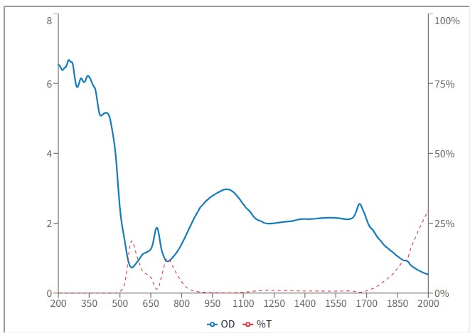 OD(Optical Density):為對雷射的阻擋力,數值越大對雷射阻擋的能力越高,在可見光雷射的應用時,須考慮對光時仍要保持看得到雷射光點而又不刺眼的狀態,因此要選擇適當的OD值,以免阻擋過大而看不到雷射光點無法對光,OD值對應穿透率與阻擋值可參考以下表格: