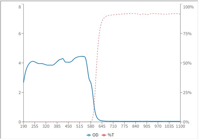 OD(Optical Density):為對雷射的阻擋力,數值越大對雷射阻擋的能力越高,在可見光雷射的應用時,須考慮對光時仍要保持看得到雷射光點而又不刺眼的狀態,因此要選擇適當的OD值,以免阻擋過大而看不到雷射光點無法對光,OD值對應穿透率與阻擋值可參考以下表格: