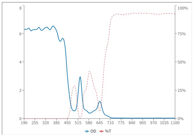 OD(Optical Density):為對雷射的阻擋力,數值越大對雷射阻擋的能力越高,在可見光雷射的應用時,須考慮對光時仍要保持看得到雷射光點而又不刺眼的狀態,因此要選擇適當的OD值,以免阻擋過大而看不到雷射光點無法對光,OD值對應穿透率與阻擋值可參考以下表格: