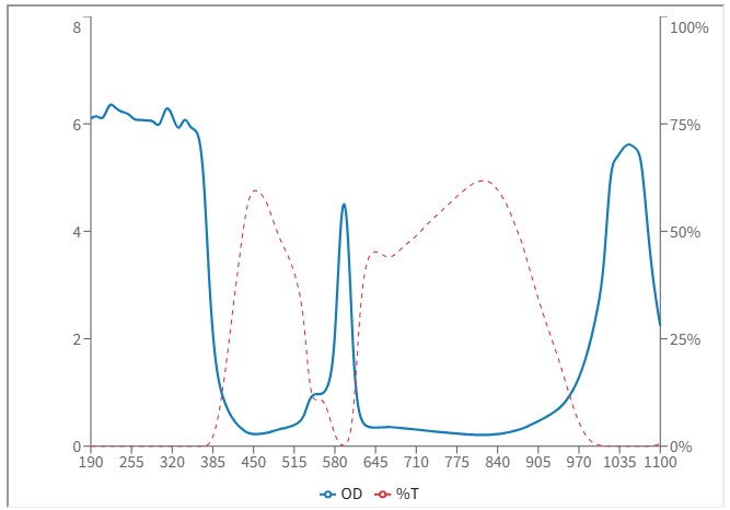 OD(Optical Density):為對雷射的阻擋力,數值越大對雷射阻擋的能力越高,在可見光雷射的應用時,須考慮對光時仍要保持看得到雷射光點而又不刺眼的狀態,因此要選擇適當的OD值,以免阻擋過大而看不到雷射光點無法對光,OD值對應穿透率與阻擋值可參考以下表格: