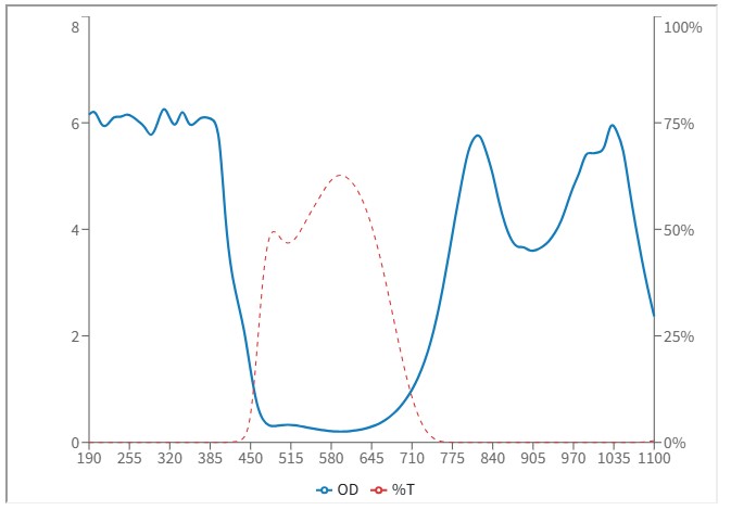OD(Optical Density):為對雷射的阻擋力,數值越大對雷射阻擋的能力越高,在可見光雷射的應用時,須考慮對光時仍要保持看得到雷射光點而又不刺眼的狀態,因此要選擇適當的OD值,以免阻擋過大而看不到雷射光點無法對光,OD值對應穿透率與阻擋值可參考以下表格: