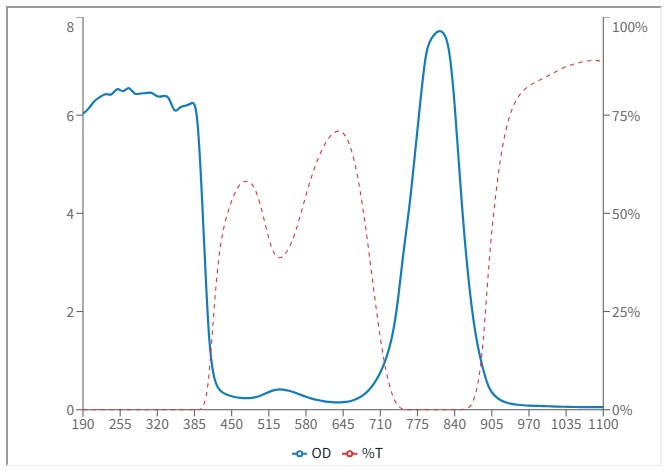 OD(Optical Density):為對雷射的阻擋力,數值越大對雷射阻擋的能力越高,在可見光雷射的應用時,須考慮對光時仍要保持看得到雷射光點而又不刺眼的狀態,因此要選擇適當的OD值,以免阻擋過大而看不到雷射光點無法對光,OD值對應穿透率與阻擋值可參考以下表格: