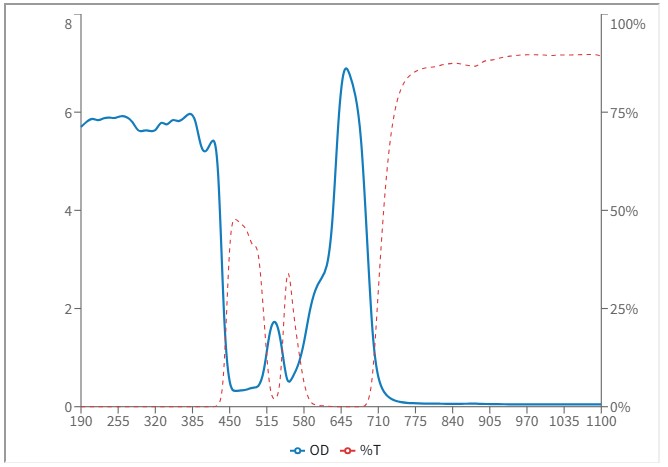OD(Optical Density):為對雷射的阻擋力,數值越大對雷射阻擋的能力越高,在可見光雷射的應用時,須考慮對光時仍要保持看得到雷射光點而又不刺眼的狀態,因此要選擇適當的OD值,以免阻擋過大而看不到雷射光點無法對光,OD值對應穿透率與阻擋值可參考以下表格: