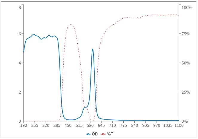 OD(Optical Density):為對雷射的阻擋力,數值越大對雷射阻擋的能力越高,在可見光雷射的應用時,須考慮對光時仍要保持看得到雷射光點而又不刺眼的狀態,因此要選擇適當的OD值,以免阻擋過大而看不到雷射光點無法對光,OD值對應穿透率與阻擋值可參考以下表格: