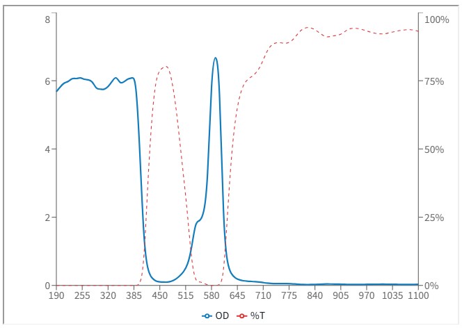 OD(Optical Density):為對雷射的阻擋力,數值越大對雷射阻擋的能力越高,在可見光雷射的應用時,須考慮對光時仍要保持看得到雷射光點而又不刺眼的狀態,因此要選擇適當的OD值,以免阻擋過大而看不到雷射光點無法對光,OD值對應穿透率與阻擋值可參考以下表格: