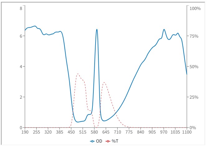 OD(Optical Density):為對雷射的阻擋力,數值越大對雷射阻擋的能力越高,在可見光雷射的應用時,須考慮對光時仍要保持看得到雷射光點而又不刺眼的狀態,因此要選擇適當的OD值,以免阻擋過大而看不到雷射光點無法對光,OD值對應穿透率與阻擋值可參考以下表格: