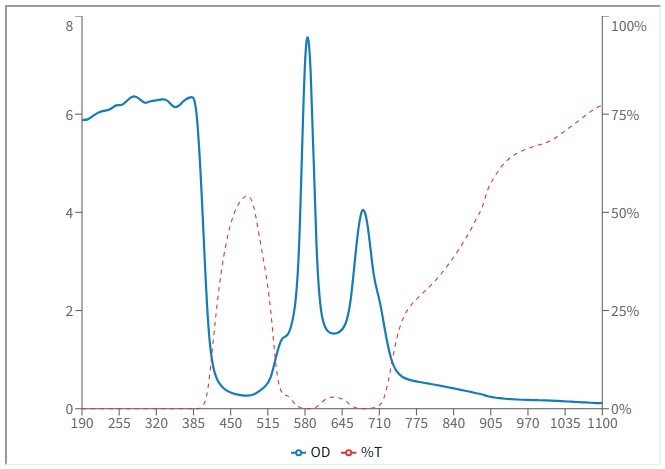 OD(Optical Density):為對雷射的阻擋力,數值越大對雷射阻擋的能力越高,在可見光雷射的應用時,須考慮對光時仍要保持看得到雷射光點而又不刺眼的狀態,因此要選擇適當的OD值,以免阻擋過大而看不到雷射光點無法對光,OD值對應穿透率與阻擋值可參考以下表格: