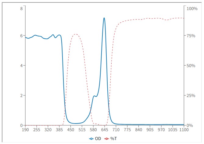 OD(Optical Density):為對雷射的阻擋力,數值越大對雷射阻擋的能力越高,在可見光雷射的應用時,須考慮對光時仍要保持看得到雷射光點而又不刺眼的狀態,因此要選擇適當的OD值,以免阻擋過大而看不到雷射光點無法對光,OD值對應穿透率與阻擋值可參考以下表格: