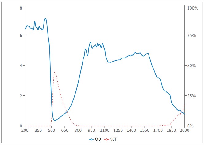 OD(Optical Density):為對雷射的阻擋力,數值越大對雷射阻擋的能力越高,在可見光雷射的應用時,須考慮對光時仍要保持看得到雷射光點而又不刺眼的狀態,因此要選擇適當的OD值,以免阻擋過大而看不到雷射光點無法對光,OD值對應穿透率與阻擋值可參考以下表格:
