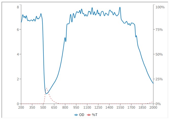 OD(Optical Density):為對雷射的阻擋力,數值越大對雷射阻擋的能力越高,在可見光雷射的應用時,須考慮對光時仍要保持看得到雷射光點而又不刺眼的狀態,因此要選擇適當的OD值,以免阻擋過大而看不到雷射光點無法對光,OD值對應穿透率與阻擋值可參考以下表格: