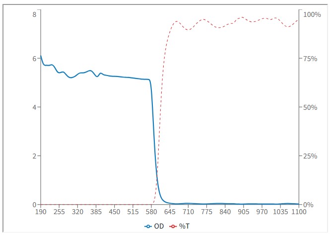 OD(Optical Density):為對雷射的阻擋力,數值越大對雷射阻擋的能力越高,在可見光雷射的應用時,須考慮對光時仍要保持看得到雷射光點而又不刺眼的狀態,因此要選擇適當的OD值,以免阻擋過大而看不到雷射光點無法對光,OD值對應穿透率與阻擋值可參考以下表格: