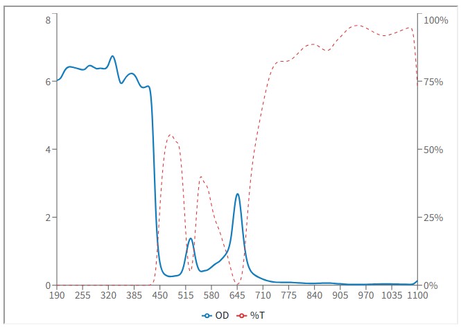 OD(Optical Density):為對雷射的阻擋力,數值越大對雷射阻擋的能力越高,在可見光雷射的應用時,須考慮對光時仍要保持看得到雷射光點而又不刺眼的狀態,因此要選擇適當的OD值,以免阻擋過大而看不到雷射光點無法對光,OD值對應穿透率與阻擋值可參考以下表格: