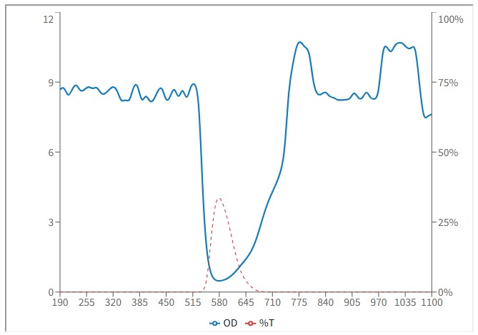 OD(Optical Density):為對雷射的阻擋力,數值越大對雷射阻擋的能力越高,在可見光雷射的應用時,須考慮對光時仍要保持看得到雷射光點而又不刺眼的狀態,因此要選擇適當的OD值,以免阻擋過大而看不到雷射光點無法對光,OD值對應穿透率與阻擋值可參考以下表格: