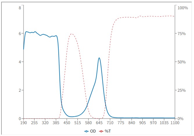 OD(Optical Density):為對雷射的阻擋力,數值越大對雷射阻擋的能力越高,在可見光雷射的應用時,須考慮對光時仍要保持看得到雷射光點而又不刺眼的狀態,因此要選擇適當的OD值,以免阻擋過大而看不到雷射光點無法對光,OD值對應穿透率與阻擋值可參考以下表格:
