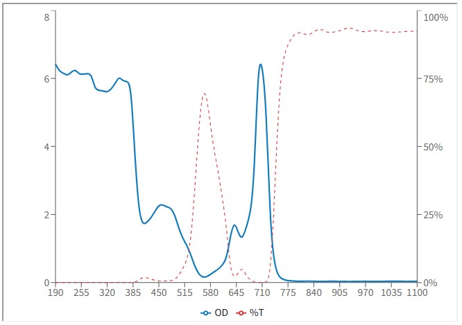 OD(Optical Density):為對雷射的阻擋力,數值越大對雷射阻擋的能力越高,在可見光雷射的應用時,須考慮對光時仍要保持看得到雷射光點而又不刺眼的狀態,因此要選擇適當的OD值,以免阻擋過大而看不到雷射光點無法對光,OD值對應穿透率與阻擋值可參考以下表格: