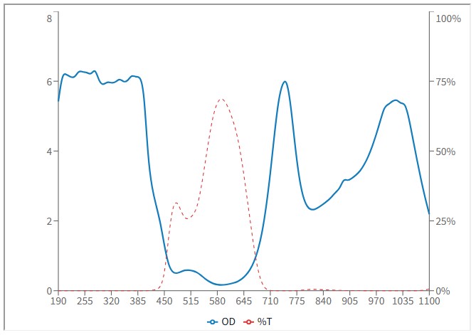 OD(Optical Density):為對雷射的阻擋力,數值越大對雷射阻擋的能力越高,在可見光雷射的應用時,須考慮對光時仍要保持看得到雷射光點而又不刺眼的狀態,因此要選擇適當的OD值,以免阻擋過大而看不到雷射光點無法對光,OD值對應穿透率與阻擋值可參考以下表格:
