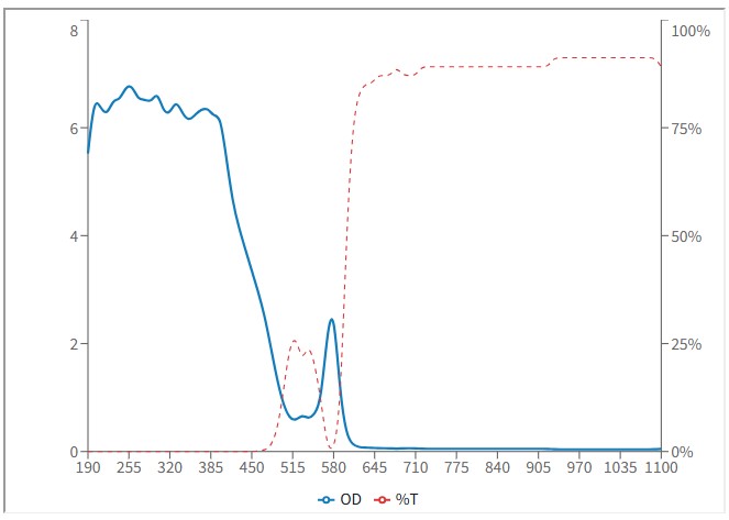 OD(Optical Density):為對雷射的阻擋力,數值越大對雷射阻擋的能力越高,在可見光雷射的應用時,須考慮對光時仍要保持看得到雷射光點而又不刺眼的狀態,因此要選擇適當的OD值,以免阻擋過大而看不到雷射光點無法對光,OD值對應穿透率與阻擋值可參考以下表格: