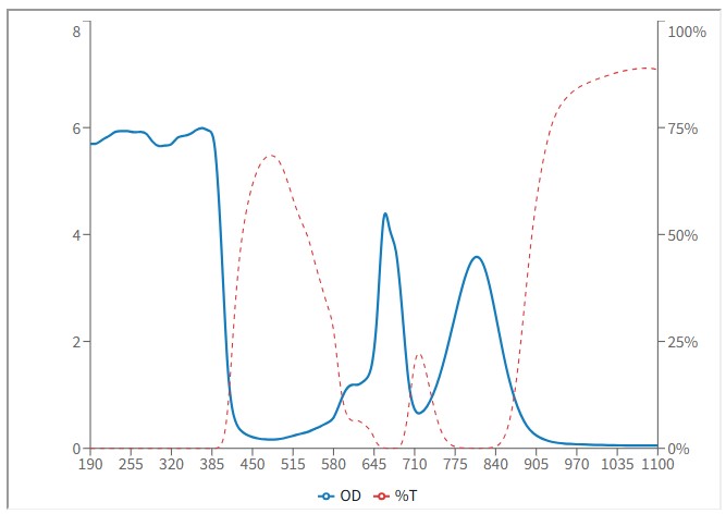 OD(Optical Density):為對雷射的阻擋力,數值越大對雷射阻擋的能力越高,在可見光雷射的應用時,須考慮對光時仍要保持看得到雷射光點而又不刺眼的狀態,因此要選擇適當的OD值,以免阻擋過大而看不到雷射光點無法對光,OD值對應穿透率與阻擋值可參考以下表格: