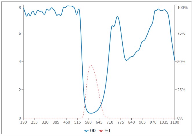 OD(Optical Density):為對雷射的阻擋力,數值越大對雷射阻擋的能力越高,在可見光雷射的應用時,須考慮對光時仍要保持看得到雷射光點而又不刺眼的狀態,因此要選擇適當的OD值,以免阻擋過大而看不到雷射光點無法對光,OD值對應穿透率與阻擋值可參考以下表格: