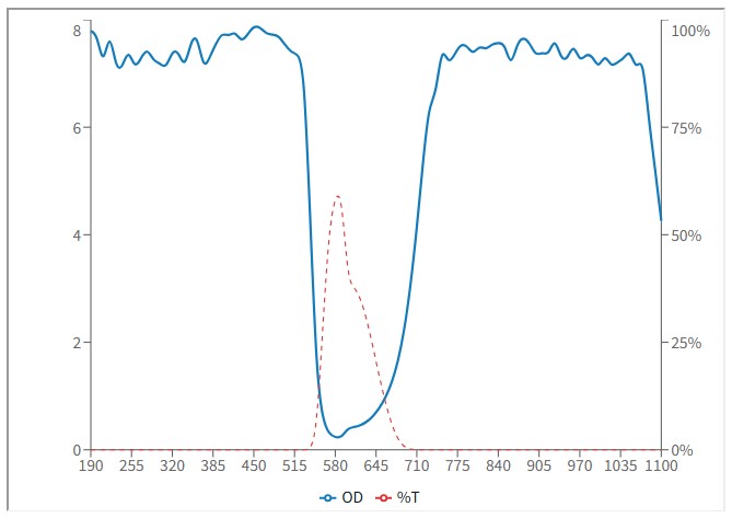 OD(Optical Density):為對雷射的阻擋力,數值越大對雷射阻擋的能力越高,在可見光雷射的應用時,須考慮對光時仍要保持看得到雷射光點而又不刺眼的狀態,因此要選擇適當的OD值,以免阻擋過大而看不到雷射光點無法對光,OD值對應穿透率與阻擋值可參考以下表格: