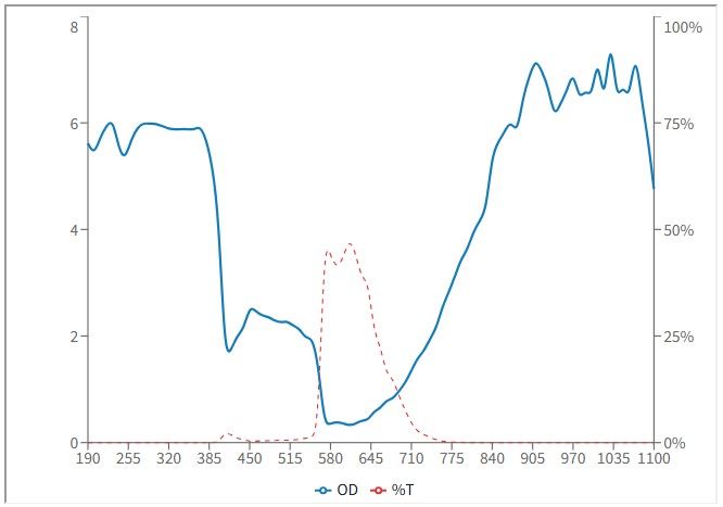 OD(Optical Density):為對雷射的阻擋力,數值越大對雷射阻擋的能力越高,在可見光雷射的應用時,須考慮對光時仍要保持看得到雷射光點而又不刺眼的狀態,因此要選擇適當的OD值,以免阻擋過大而看不到雷射光點無法對光,OD值對應穿透率與阻擋值可參考以下表格: